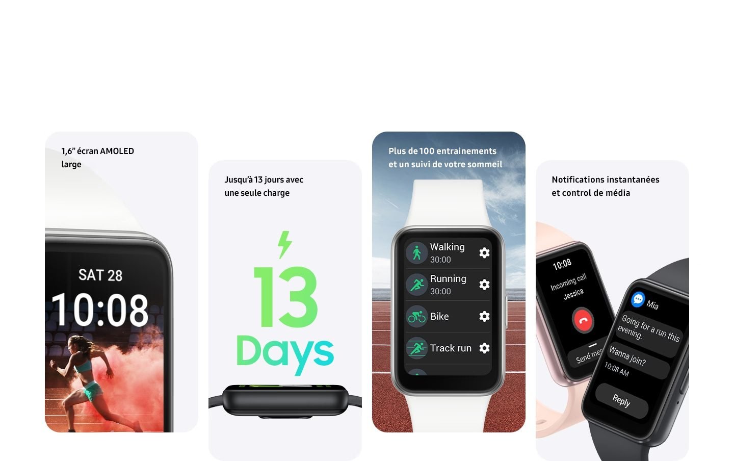 - Design Élégant : Avec un écran AMOLED vibrant, la Galaxy Fit3 présente un design moderne et léger, parfait pour un usage quotidien et lors de vos activités sportives.
