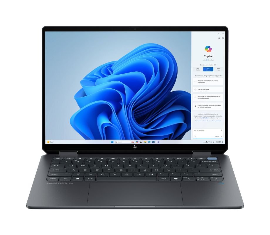 PC portable convertible 2-en-1 HP OmniBook Ultra Flip 14 avec Intel Core Ultra 7 AI Boost, 16Go LPDDR5x, SSD 512Go, écran OLED 3K tactile 120Hz et Windows 11.